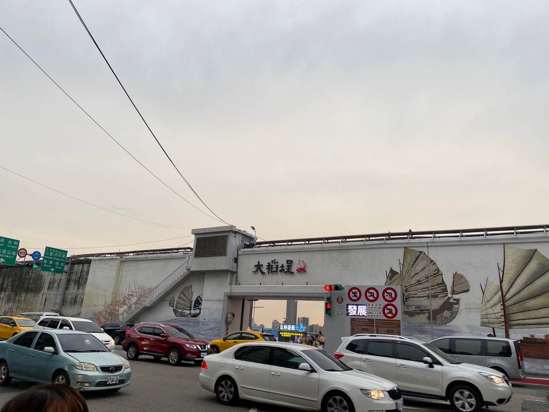 我們趕在傍晚5:30前到達大稻埕碼頭,很幸運的雲層稀薄、太陽也還未落下,近6:00時成功欣賞到了美麗的夕陽, 並在此拍下了許多美好的合照。